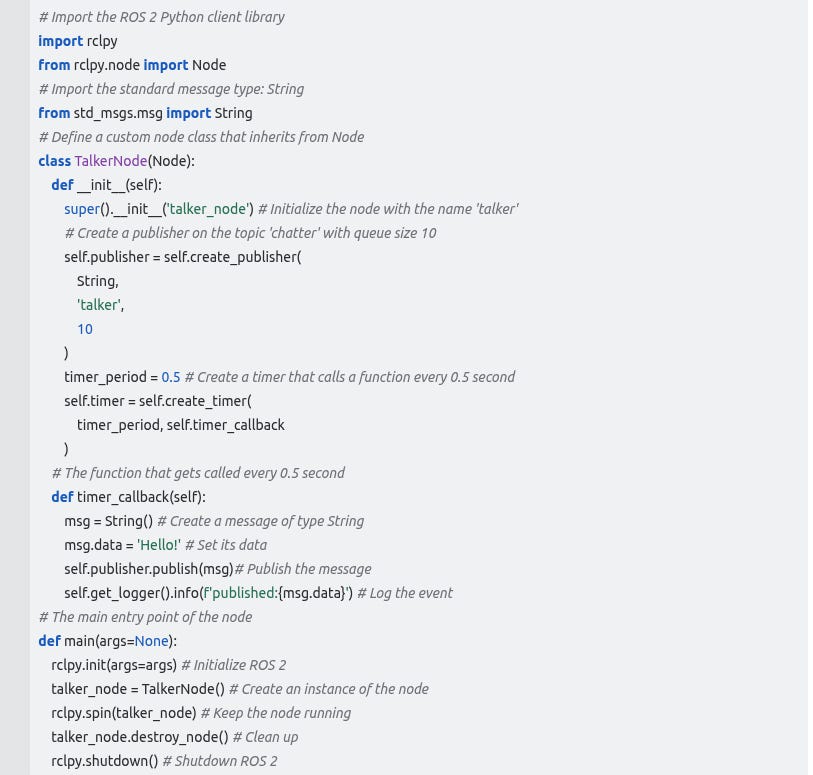ros2 pkg create --build-type ament_python listener --dependencies rclpy std_msgs2. Implement the Talker Node (Publisher)