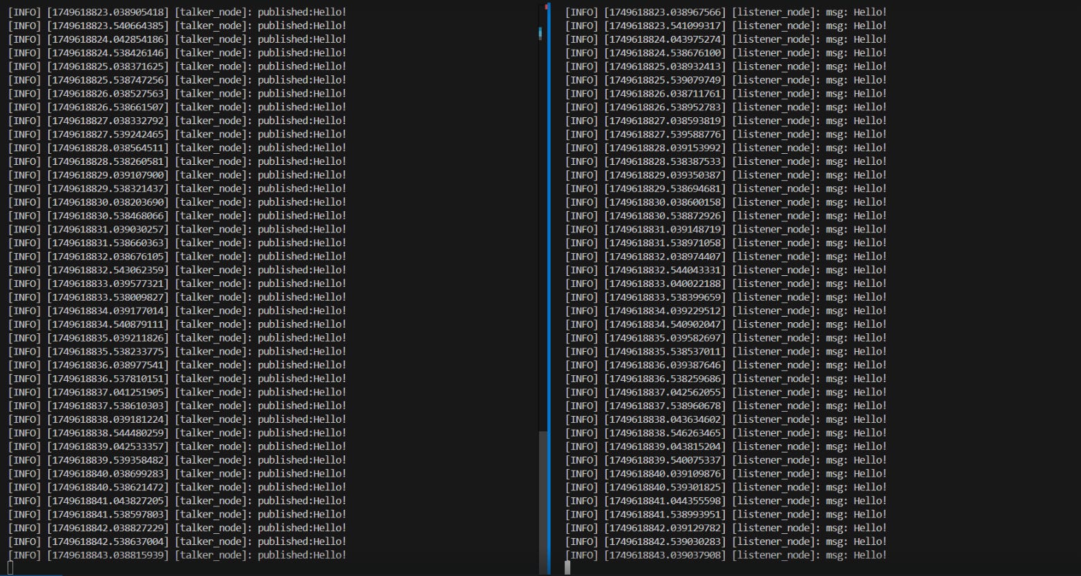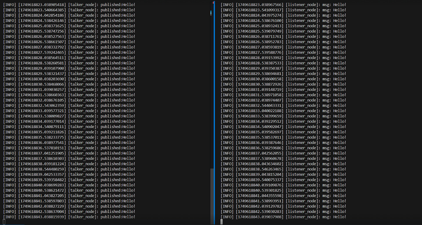 source ~/ros2_ws/install/setup.bash ros2 run <listener_pkg> listenerWhen running the system the following should be the results: