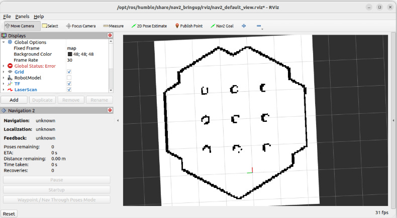 Now, you should just see the map on the screen, but no robot. You’ll also see some kinds of error logs in the terminal. This is because Nav2 doesn’t know where your robot is, and you need to provide the first 2D pose estimate.
