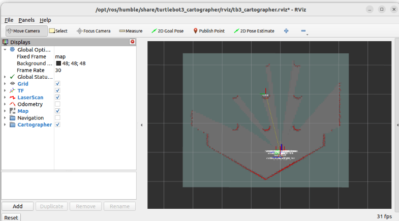 You can see the TFs of the robot, as well as the LaserScan from the Lidar sensor (red dots). Some pixels are already grey/black. As you make the robot move, pixels will be cleared into 3 categories: