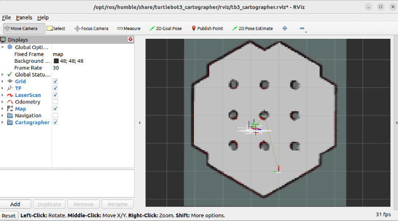 ros2 launch turtlebot3_cartographer cartographer.launch.py use_sim_time:=TrueNote: I provide the “use_sim_time” argument because we are running on Gazebo, so we want to use the Gazebo time. If using a real robot, skip this argument.