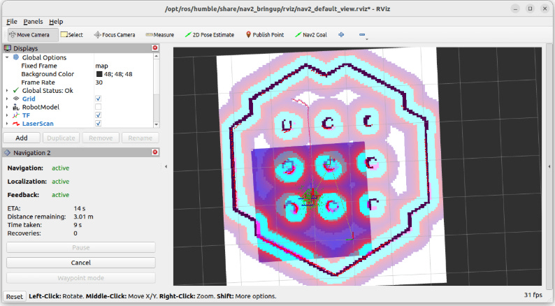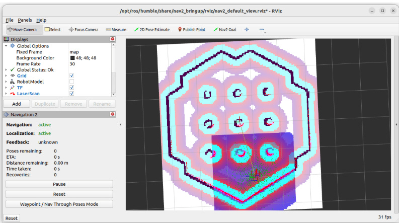 ros2 launch turtlebot3_navigation2 navigation2.launch.py use_sim_time:=True map:=path/to/my_map.yamlNote: use “use_sim_time” only if running with Gazebo. For the “map” argument, provide the path to the YAML file of the map.