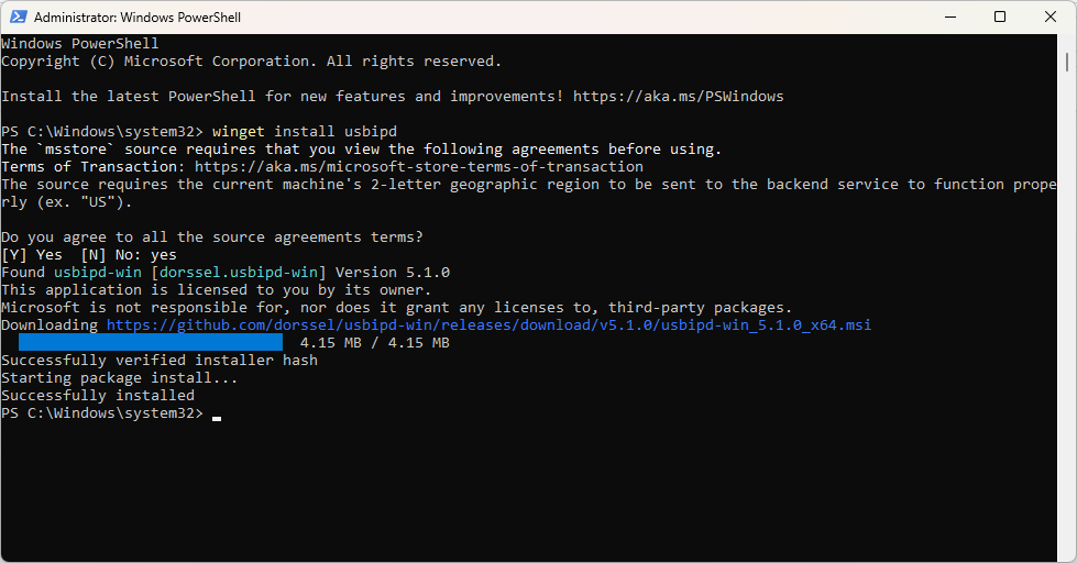 winget install usbipdUsbipd will install as shown below: