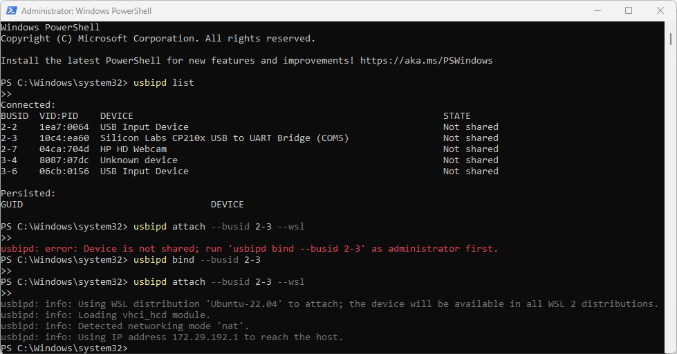 2-3on your Windows host, making it available for remote access over USB/IP—typically for use in WSL. Run the code below to implement this.